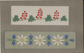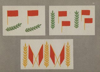 В качестве элементов узора дети учатся использовать разнообразные линейные формы (толстые и тонкие линии, мазки, точки, круги) и более сложные формы - растительные (листья, ягоды, цветы), которые труднее повторять несколько раз. Ребятам показывают новый прием рисования кистью, прикладывание к бумаге кисти плашмя. Полученные отпечатки в форме лепестка хороши в узоре из листьев, цветов.