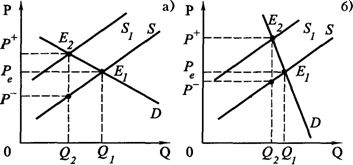 спросе по цене (а); при неэластичном спросе по цене (б)