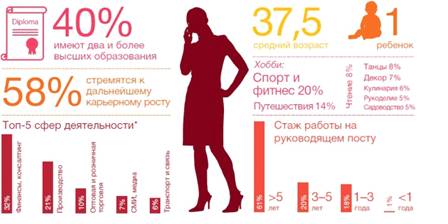 Это женщина 37,5 лет, воспитывающая одного ребенка и обладающая значительным профессиональным опытом (61% занимает руководящую должность более 5 лет). Она хорошо образованна: 40% опрошенных женщин имеют два или более высших образования, а 9% - степень МВА или ученую степень.