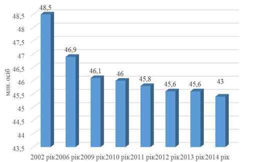 Згідно з даних рисунка 2.1. ми бачимо, що населення України скоротилося з 2002 р. до 2014 р. на 5,5млн. осіб. З 2002 р. по 2006 населення України скоротилося 1.6 млн. осіб. З 2006 р. по 2009 р. населення зменшилося на 800 тис. осіб. Така тенденція, що до скорочення населення спостерігається і протягом наступних років: 2010р. (-180,8 тис.), 2011р. (-184,4 тис.), 2012р. (-144,9 тис.), 2013р. (-80,6 тис.), 2014 (-2600 тис.). Отже ми бачимо збереження тенденції скорочення чисельності населення України, його економічно активної частини і питомої ваги зайнятості населення. Це зумовлено насамперед від’ємним природним приростом.