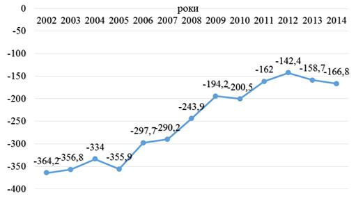Згідно даними рисунка 2.4. ми бачимо що у 2002 році природний приріст становив -364,2 тис. осіб. Проте вже у 2004 році він збільшився на 30,2тис. до -334 тис. осіб. Але вже у 2005 році природний приріст знову почав зменшуватися і досяг відмітки у -355,9 тис. осіб. Проте в період 2005-2012 років природний приріст почав показувати позитивну тенденцію до збільшення і вже на кінець 2012 року природний приріст становив -142,4 тис, осіб. Основною причиною певного покращення є то, що протягом цього періоду кількість новонароджених збільшувалася, а кількість померлих зменшувалася (рис. 2.5.). Але не зважаючи на певні покращення показник природного приросту залишається від’ємним. У 2013 році він знову зменшився на -16,3 до 158,7 тис. осіб. Постійно від’ємне значення природного приросту негативно впливає на демографічну безпеку України. Адже в порушується процес заміни одного покоління іншим що веде в майбутньому до вимирання нації.