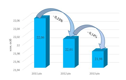 0,23% (рис.2.8 ). І у 2013 р. цей показник зменшився до 21,98 млн. осіб, або на