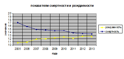 Чтобы оценить рождаемость составляем таблицу, где указываем коэффициент рождаемости за период с 2005-2013г.г. Коэффициент рождаемости - отношение числа рождений за год к средней численности населения за тот же период, выражается в промилле, то есть на 1 тыс. населения.