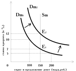 Представим теперь, что меняется спрос на деньги, а предложение останется неизменным (линия Sm1). Допустим, что спрос на деньги вырос в результате увеличения номинального ВНП, когда требуется больше денег для обслуживания товарооборота в рамках национальной экономики, а население и фирмы свои активы держат в денежной форме. При неизменном предложении денег равновесие может установиться когда увеличится цена денег (номинальная ставка процента).
