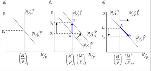Рассмотрим теперь последствия изменения предложения денег для равновесия де-нежного рынка. Предположим, что центральный банк увеличил предложение денег, и кривая предложения денег сдвинулась вправо от (М/Р)S1 до (М/Р)S2 (граф.4.1(в)). Как вид-но из графика, результатом является восстановления равновесия денежного рынка за счет снижения ставки процента от R1 до R2.