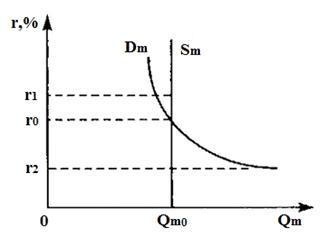 Точка пересечения графиков спроса на деньги (Dm) и денежного предложения (Sm) определяет равновесную ставку процента и равновесный объем денежной массы. Равновесие на денежном рынке складывается при процентной ставке r0 и массе денег Qm0.