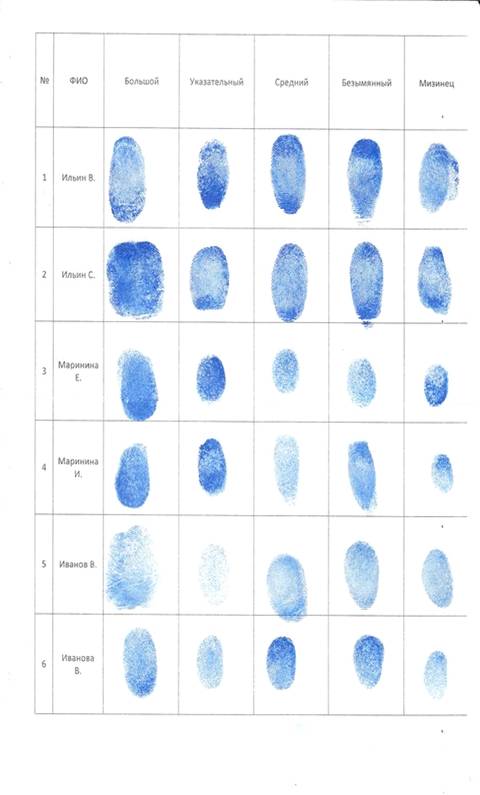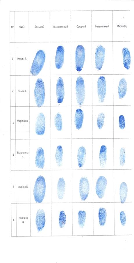 . Анализ таблицы №1 показал, что каждый из нас имеет неповторимые узоры. Однояйцевые близнецы не только внешне похожи друг на друга, но и узоры на пальцах больше совпадают, чем у разнояйцевых близнецов. Наиболее распространенным узором является - петля, а меньше всего встречаются завиток, дуга.