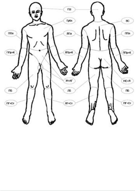 ГШ — голова и шея; ГрКл — грудная клетка; ВС — верхняя часть спины; НС+Я — нижняя часть спины и ягодицы; Ж+АГ — живот и аногенитальная область; ППл — правое плечо; ЛПр+К — левое предплечье и кисть; ППр+К — правое предплечье и кисть; ЛПл — левое плечо; ЛПр+К — левое предплечье и кисть; ПБ — правое бедро; ПГ+Ст — правая голень и стопа; ЛБ — левое бедро; ЛГ+Ст — левая голень и стопа.