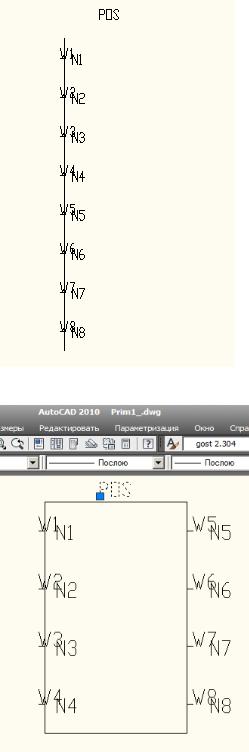 Все атрибуты задаются видимыми. Ввод атрибутов выполняется в порядке : все номера зажимов в любом порядке и далее TIP, POS, PN. Местом установки атрибута номера зажима служит точка присоединения внешнего проводника, угол - угол ввода адресной части присоединения (если провод подключается справа – угол 0; сверху – 90; слева – 180; снизу - 270). Рекомендуется расстояние между точками присоединения внешних присоединений брать не менее 8мм.