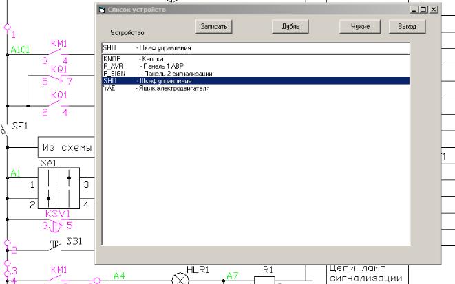 После выбора "Перечень" на экран выводится список позиционных обозначений аппаратов, используемых в схеме, их наименования (если они уже заданы) и устройства, которым принадлежат аппараты. (При разработке НКУ вместо устройств выступают МЕ или блоки).
