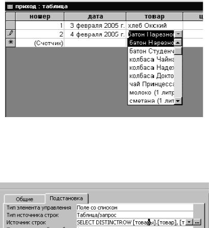 Пока мы заполнили только две записи, но уже почувствовали неудобства, связанные с тем, что тексты в столбце подстановки расположены в произвольном (неалфавитном порядке). Не поленимся еще раз войти в режим конструктора. Выделим поле «товар» и в свойствах поля внизу окна конструктора перейдем на заставку «Подстановка» (рис. 54).