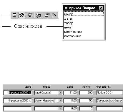 5.3. Создание формы «приход». В разделе «Формы» окна базы данных нажмем кнопку «Создать», в диалоге выберем ленточную форму, в качестве источника данных возьмем «приход Запрос» и выберем для формы все поля источника! Сохраним форму, дав ей имя «приход». То, что имя формы совпадает с именем таблицы, не должно нас беспокоить. Мы могли, конечно, пойти по проторенной дорожке, создав форму «в столбец», а затем связав ее с ленточной формой, но хотя бы для разнообразия поступим иначе. Откроем форму в рабочем режиме и посмотрим, что нам в ней не нравится. Для некоторых полей система выделила слишком много места, а для других места явно не хватает. Поле «номер» (вместе с подписью к нему) можно без ущерба для содержания удалить из формы. Полезно разместить в примечании формы кнопку выхода. Перечисленные манипуляции не должны вызывать у нас какихлибо затруднений, мы их не раз проделывали. Но иногда также при построении формы в автоматическом режиме игнорируются созданные нами подстановки и форма выглядит, как на рис. 56. Как видно на рисунке, вместо названий товаров и поставщиков представлены только их коды. Чтобы устранить подобный дефект, нужно развернуть «Список полей» (рис. 57) с панели инструментов «Конструктора форм».
