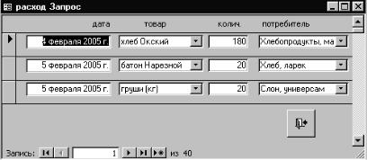 5.5. Форма «расход». Создадим запрос «расход Запрос» и в режиме конструктора введем упорядочивание записей по дате (теперь под датой подразумевается дата отпуска товара). Используя построенный запрос в качестве источника данных, создадим ленточную форму «расход» точно так же, как в разделе 5.3.