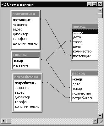 5.6. Связи между таблицами. В рассмотренных выше примерах при вводе товаров, поставщиков и потребителей мы видим на экране их названия, хотя теперь знаем, что физически таблица хранит только коды. Такое удобство создал нам мастер подстановок. Одна из таблиц играет роль справочника по кодам, хранящимся в другой таблице. Таким образом, между таблицами можно установить связи. Виды связей в этом разделе мы разбирать не будем. Однако заметим, что связи между таблицами всегда устанавливаются по определенным полям. Для того, чтобы получить схему связей между таблицами, надо в строке горизонтального меню выбрать пункт СервисСхема данных. Если в появившемся окне «Схема данных» (рис. 62) интересующая Вас связь отсутствует, то можете щелкнуть правой клавишей мыши и в развернувшемся окне выбрать пункт «Отобразить все».