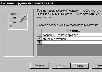 7.2. Группа переключателей. Откроем форму «отчет_приход» в режиме конструктора. Поместим в форму элемент управления «Группа переключателей» (см. Шаг второй, рис. 15). Откроется диалоговое окно