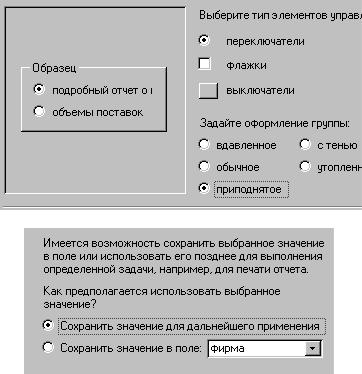 У нас пока создано два отчета. Возможно, Вы создали больше. В любом случае каждому отчету мы поставим в соответствие переключатель. Введем подписи к двум переключателям (рис. 85) и нажмем «Далее». Теперь система потребует задать переключатель, используемый по умолчанию. Здесь Вы можете поступать по своему усмотрению. Нажмите «Далее». Вы увидите список, в котором каждой подписи соответствует натуральное число. Система по умолчанию в каждой строке устанавливает число, равное номеру строки. Мы имеем право изменить заданные системой значения, но не хотим. Поэтому нажмем «Далее». Оставим переключатель (рис. 86) в положении «Сохранить значение для дальнейшего использования» и нажмем «Далее».