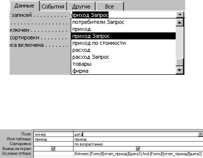 свойств отчета. Окно свойств отчета открывается точно так же, как и окно свойств формы. Выберем заставку «Данные» и щелкнем клавишей в строке «Источник записей». Развернем меню и выберем в качестве источника «приход Запрос» (рис. 94).