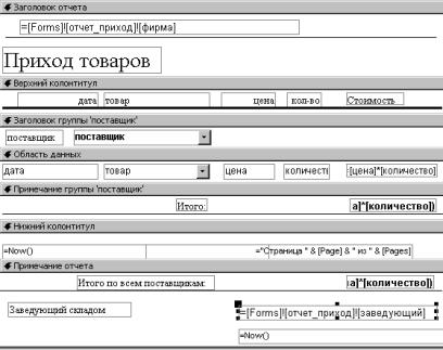 7.5. Дополнительная информация в отчете. Осталось внести в отчет две небольших корректировки: поместить в заголовок отчета название фирмы, а в примечание отчета – поле для подписи. В форме «отчет_приход» установим переключатель в положение «подробный отчет о приходе», откроем соответствующий отчет и переведем его в режим конструктора. С панели элементов возьмем элемент управления «поле» и поместим его в заголовок отчета. Надпись, соответствующую полю, удалим. В случае необходимости расширим заголовок и сдвинем вниз название отчета. Поместим в поле выражение =[Forms]![отчет_приход]![фирма], то есть название фирмы. Теперь становится ясно, зачем мы назначили в качестве источника данных для формы «отчет_приход» таблицу «фирма»! Аналогично в примечание отчета поместим надпись «Заведующий складом», содержащую выражение =[Forms]![отчет_приход]![заведующий], то есть Ф. И. О. заведующего складом, а также текущую дату, определяемую функцией