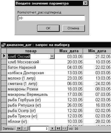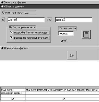 Здесь «Min_дата» – имя вычисляемого поля, содержащего дату, предшествующую Max_дата. Функция DateAdd вычисляет дату, отличающуюся от исходной на заданное количество единиц времени. Первый аргумент «y» задает единицу времени – день. Кроме того, время может измеряться в неделях, месяцах, годах и даже в минутах, секундах и часах. Второй аргумент: -[Forms]![отчет_расход]![период]. Этот аргумент указывает, сколько единиц времени надо отступить от заданной в третьем аргументе даты. В качестве его значения берется значение поля «период» формы «отчет_расход» со знаком «минус», указывающим, что отсчет идет в обратном направлении. Тот факт, что запрос использует