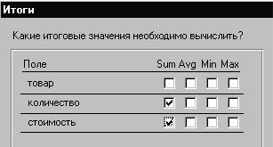 Сделаем запрос итоговым. Поэтому поле «товар», по которому будет производиться группировка, должно стоять в списке первым. По полям «количество» и «стоимость» будем производить суммирование (рис.