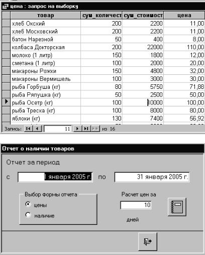 Теперь осталось только создать отчет по наличию товаров. Вывод и печать отчетов по наличию товаров и средним ценам будет происходить из формы «Отчет о наличии товаров» (рис. 113).