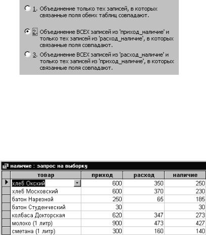 Фактически этот запрос будет просто копией своего источника и его можно было бы создать из запроса «приход_наличие», используя команды меню «Правка Копировать» и «Правка Вставить». Теперь откроем новый запрос в режиме конструктора, нажмем правую клавишу мышки в области таблиц запроса и выберем пункт меню «Добавить таблицу». В диалоговом окне перейдем на заставку «Запросы», добавим «расход_наличие» и закроем окно. Установим связь между запросами по полю «товар» (рис. 110). Мы уже знаем, что параметры объединения можно получить, щелкнув дважды левой клавишей по линии, связывающей таблицы или запросы. По умолчанию будут объединены только те записи, в которых связанные поля обеих таблиц совпадают. Это значит, что если некоторый товар имеется в таблице «приход», но не фигурирует нигде в таблице «расход», то в запросе «наличие» он не будет отражен. Это нас совершенно не устраивает. Ведь товар в наличии имеется! Поэтому мы должны изменить параметры объединения, установив переключатель в положение «Объединение всех записей из «приход_наличие» и только тех записей из «расход_наличие», в которых связанные поля совпадают» (рис. 111). Теперь можете убедиться, что любой товар, фигурирующий в приходе, но отсутствующий в расходе, будет отражен в запросе «наличие». В соответствующей ячейке Вы увидите «пробел». Однако фактически поле получит значение «Null», которое иначе называют «пустым значением». Это значение нельзя путать с нулем или с пустой строкой. Значение «Null» не равно никакому другому значению и поэтому не может участвовать в арифметических выражениях. Добавим в запрос «наличие» вычисляемое поле «наличие»: