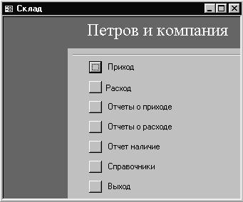 Закроем страницу, выделим страницу «Склад» и откроем ее для изменения. На этой странице создадим кнопку с надписью «Справочники» и поставим ей в соответствие команду «Переход к кнопочной форме», ниже выберем в меню страницу кнопочной формы «Справочники». Также создадим кнопку «Выход», которая будет выполнять запуск макроса, созданного нами под именем «Макрос1.выход из приложения». При нажатии на эту кнопку будет осуществляться выход не только из базы данных, но и из Microsoft Access. Если теперь Вы войдете в раздел «Таблицы», то обнаружите новую таблицу, которая содержит всю информацию о кнопочной форме. Эту таблицу переименовывать нельзя и вообще лучше не трогать! Кнопочную форму можно редактировать в режиме конструктора, как и любую другую. В частности, Вы можете вставить рисунок, соответствующий назначению приложения. Проверьте форму «Главная» в работе (рис. 117). Теперь приложение готово к эксплуатации.