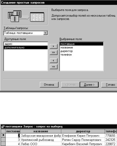 Мы отберем для запроса поля: поставщик, название, директор и телефон. Нажимаем «Дальше». В следующем окне предлагается дать имя запросу. Оставим предложенное системой имя «поставщики Запрос» и нажмем «Готово». На экране появится таблица (рис. 9). Эта таблица содержит выбранные нами поля таблицы «поставщики».
