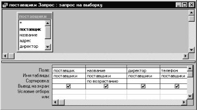 Как видно из рисунка, в верхней части окна конструктора расположены таблицы (в данном случае одна таблица), которые послужили источником данных для запроса. В нижней части – таблица, столбцы которой представляют поля запроса, а в строках указываются характеристики полей.