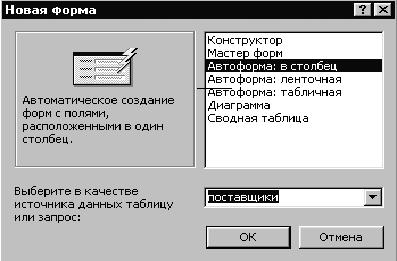 На экране появится диалоговое окно «Новая форма» (рис. 11). Выберем «автоформу в столбец», в нижней части окна развернем меню и в качестве источника данных для формы назначим таблицу «поставщики». Теперь для создания формы достаточно нажать «OK». На рис. 12 представлена первая созданная нами форма «в столбец». Справа от названий полей расположены сами поля ввода/вывода. В этих полях Вы можете просматривать и редактировать данные о конкретном производителе. Полю «дополнительно» мы приписали тип «MEMO», и, таким образом, это поле может хранить текстовую строку произвольной длины. При вводе данных в этом поле справа появляется полоса прокрутки. Часть формы, в которой расположены поля ввода/вывода, называется областью данных. В правом верхнем углу находятся кнопки оконного меню, которые в комментариях не нуждаются. В левой части окна формы Вы видите помеченную стрелкой область выделения. Если по этой области