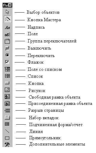 Если пользователь работает с созданной Вами формой часто, с некоторого момента, возможно, его начнет раздражать необходимость каждый раз при выходе нажимать на маленький крестик. В таком случае можно предусмотреть кнопку выхода. Кнопку следует взять с «Панели элементов» (рис. 15). Но, прежде, поясним назначение представленных на панели объектов.