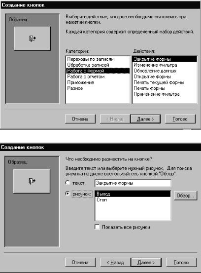 Вразделе «Категории» диалогового окна выберем пункт меню «Работа с формой», а в разделе «Действия» – «Закрытие формы». Теперь нажмем «Далее». Появится диалоговое окно (рис. 17). В новом диалоговом окне задается оформление кнопки. Если выбрать переключатель «текст» и в поле, расположенном справа от переключателя, ввести текст, этот текст будет расположен непосредственно на кнопке. Мы оставим значение переключателя «рисунок». В левой части окна изображен рисунок, который будет находиться на кнопке. Если Вы хотите выбрать другой рисунок, то должны установить «флажок», расположенный возле надписи «Показать все рисунки». Тогда в поле «рисунок» развернется список имеющихся в нашем распоряжении стандартных рисунков, и Вы можете выбрать тот, который Вас больше устраивает.