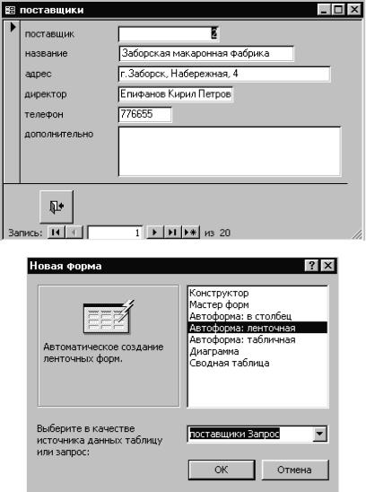 Созданная форма удобна для просмотра, ввода и редактирования информации, относящейся к конкретному поставщику. Однако при большом количестве записей найти нужного производителя в такой форме не легко. Прежде чем приступить к разрешению противоречия между эффективностью поиска и удобством просмотра, мы должны создать еще одну форму.