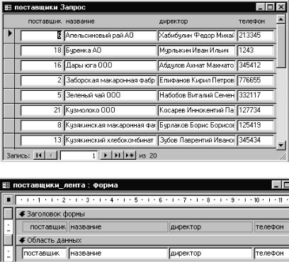 Теперь в окне базы данных выделим объект «поставщики_лента» и нажмем кнопку «Конструктор». Ленточная форма открыта в режиме кон-