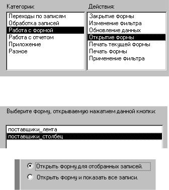 зать две ранее созданные нами формы. Для этого откроем форму «поставщики_лента» в режиме конструктора, возьмем с панели элементов кнопку и поместим ее в примечание формы. В открывшемся диалоговом окне «Создание кнопок» выберем категорию «Работа с формой» и действие «Открытие формы» (рис. 22).