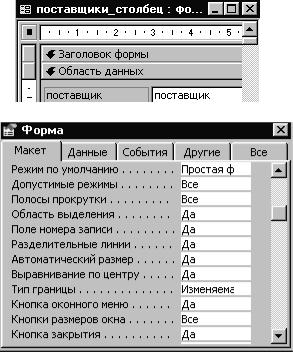 Для просмотра и изменения свойств формы достаточно дважды щелкнуть левой клавишей по квадратику, расположенному в левом верхнем углу окна формы слева от линейки (рис. 35). Этот квадратик устанавливается или убирается вместе с линейкой командой меню окна приложения «Вид Линейка». Окно свойств имеет пять заставок: Макет, Данные, События, Другие, Все. Каждая заставка представляет собой список, в левой части которого указано свойство (то есть название свойства), а в правой – значение свойства. При щелчке левой клавиши мыши в соответствующей строке списка иногда появляется направленная вниз стрелка – предложение развернуть меню. В таком случае значение свойства выбирается из меню. Изменим значения ряда свойств. Для этого выберем заставку «Макет» и установим следующие свойства.