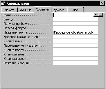 Обратите внимание на присвоенную окну подпись «Кнопка: вход». Здесь указан класс, к которому принадлежит элемент управления – «Кнопка», и заданное нами в диалоговом окне при создании кнопки имя представителя класса – «вход». Выберем заставку «События». С любым элементом управления могут происходить некоторые события. Набор событий в общем случае зависит от класса, к которому принадлежит объект, и каждому событию можно предписать определенные действия. Набор событий, которые могут происходить с кнопкой, представлен на рис. 37. Подробное истолкование этих событий можно найти в любом справочнике по Microsoft Access. Нас сейчас интересует событие «Нажатие кнопки». Этому событию, как видно из рисунка, соответствует «Процедура обработки событий». Дело в том, что когда, при создании кнопки, мы в диалоговом окне задавали параметры элемента управления и, в частности, связанные с этой кнопкой действия, система сама написала за нас процедуру (то есть небольшую программу) на встроен-