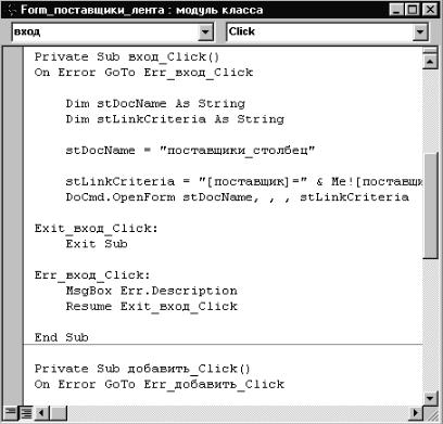 Обратите внимание! В верхней части «Окна модуля» слева расположено название элемента управления (вход), а справа – название события (Click). Событие Click как раз и есть нажатие кнопки. Пользуясь полосой прокрутки, просмотрим содержимое окна.