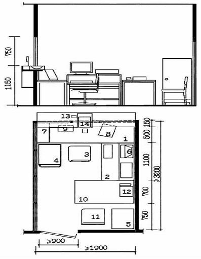 стол подсобный; 11 - стул; 12- факс; 13 - переговорное устройство; 14 -