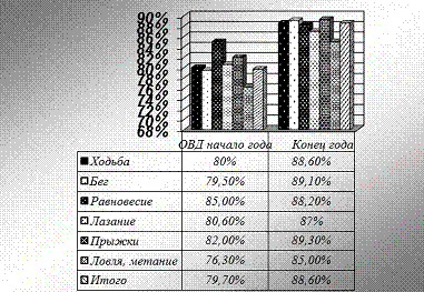 Показатели освоения основных видов движения по ДОУ согласно возрастным нормам - 88,6%, что выше показателей прошлого года на 3,6 %.