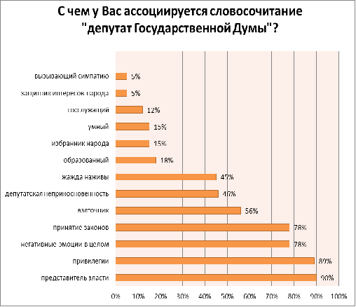 . Словосочетание «депутат Государственной Думы» вызывает у большинства респондентов, в основном негативные ассоциации: «взяточник» (56 %), «жажда наживы» (45 %), негативные эмоции в целом (78 %).