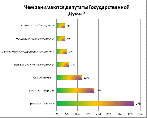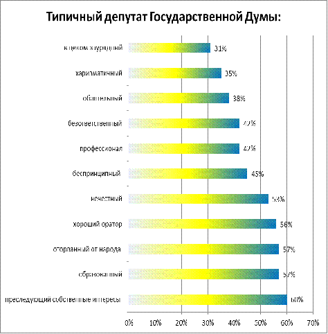 . Однако представления о типичном депутате очень противоречивы: с одной стороны, респонденты считают депутатов образованными (57%), профессионалами (42%), обаятельными(38%) и даже харизматичными (35%). С другой стороны - преследующими собственные интересы(60%) и оторванными от народа (57%), безответственными (42%).