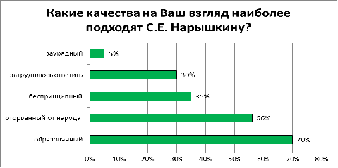 Наиболее подходящие качества С.Е. Нарышкина, выбранные респондентами -образованный(70%), оторванный от народа (56%), беспринципный (35%), заурядный (5%). Так же 30% указали, что не могут ответить на данный вопрос т.к. абсолютно ничего не знают о С.Е. Нарышкине (см. Диаграмму №11).
