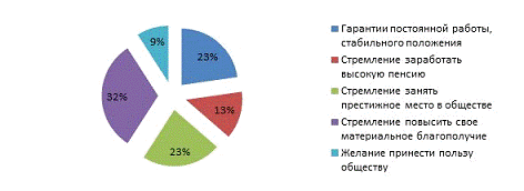 Исследовав систему мотивации, я сделала соответствующие выводы: главным мотивом поступления работника на государственную службу становится стремление повысить свое материальное благополучие. Такого рода стимул, как желание принести пользу обществу, что, по сути, идентифицируется как смысл государственной службы, в действительности является далеко не таким уж и значимым.