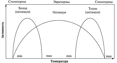 Рис. 3. Диапазон активности эвритермных и стенотермных