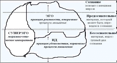 Психоаналитический подход З. Фрейда к личности представлен двумя базовыми концепциями. Первая ранняя концепция: организация психики через "топографическую модель". Согласно этой модели личностной организации в психической жизни выделяют три уровня [31]: