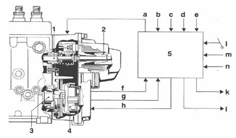 1 - рейка; 2- исполнительный механизм; 3 - кулачковый вал; 4 - датчик частоты вращения коленчатого вала; 5 - ECU. Входные/выходные величины: а - отключение при избыточной подаче; b - повышение давления; с - скорость движения автомобиля; d - температура (вода, воздух, топливо): е - изменение впускаемого количества топлива; f - скоростной режим: g - перемещение рейки; h - положение соленоида; i - индикатор расхода топлива и частоты вращения; к - диагностика; i- положение дросселя; m - заданный скоростной режим; n - сцепление, тормоза, торможение двигателем.