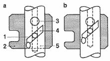 а - начало подачи топлива; b- конец подачи топлива; 1 - регулирующая спиральная канавка; 2 - регулирующая втулка; 3 - выпускное отверстие; 4 - регулирующая канавка; 5 - плунжер насоса.