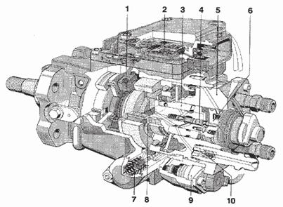 - датчик (угла/времени); 2 - ECU; 3 - ротор; 4 - игла соленоидного клапана; 5 - кожух распределителя; 6 - соленоид управления давления: 7 - устройство для регулирования опережения впрыскивания топлива: 8 - радиально-плунжерный насос; 9 - управляющий электромагнитный клапан; 10 -обратный клапан.