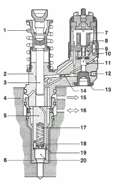 - пружина; 2 - корпус насоса; 3 - плунжер насоса; 4 - головка цилиндра; 5 - держатель пружины; 6 - стяжная гайка; 7 - статор; 8 - якорная пластина; 9 - игла соленоидного клапана; .10- стяжная гайка соленоидного клапана; 11 - заглушка канала высокого давления; 12 - заглушка канала низкого давления; 13 - упор иглы соленоида; 14 - сужение; 15 - возврат топлива; 16 - подача топлива; 17 - инжектор; 18 - нажимной штифт: 19 - прокладка; 20 - распылитель.